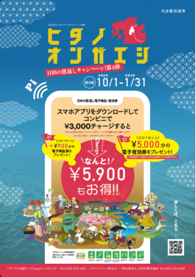 大分県日田市、スマホアプリをダウンロードして、コンビニで¥3,000チャージすると、¥5,900分お得な観光キャンペーン始まる!!