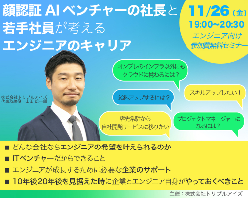 来る2021年11月26日(金)、株式会社トリプルアイズ(本社:東京都千代田区 代表者:山田 雄一郎 以下、トリプルアイズ)は、「エンジニア成長第一主義セミナー第2弾〜顔認証AIベンチャーの社長と若手社員が考えるエンジニアのキャリア」と題し、エンジニア向けの無料セミナーをリアルとオンラインで同時開催いたします。