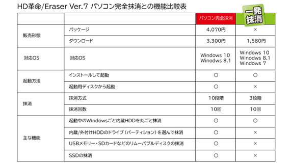 【HD革命/Eraser機能比較表】