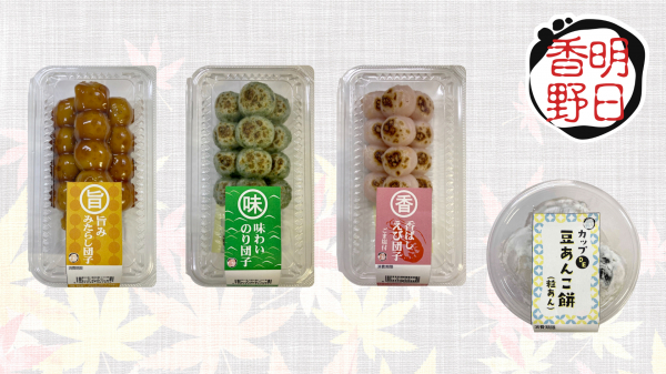 明日香野がエイドで提供予定の和菓子は、甘じょっぱさが好評の串団子「旨み みたらし団子」、「香ばし えび団子」、「味わい のり団子」、カップ入りでランナーの方に手に取っていただきやすい「カップDE 豆あんこ餅」、明日香野の看板商品の1つ「磯部餅」、秋を感じる和菓子「ごろっと 栗づくし」、「ごろっと 木の実」など多数になります。