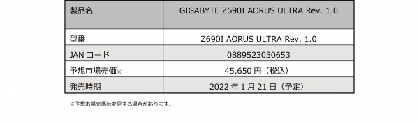 GIGABYTE社製、Intel Z690 Expressチップセットを搭載した マザーボード「GIGABYTE Z690I AORUS ULTRA Rev. 1.0」を発売