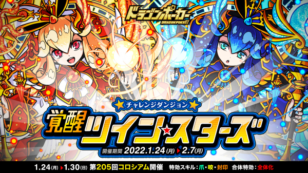 株式会社アソビズム(本社:東京都千代田区、代表取締役:大手智之)は、App Store・Google Playにて好評配信中のリアルタイム合体カードバトル『ドラゴンポーカー』で、2022年1月24日(月)より 復刻チャレンジダンジョン「覚醒ツインスターズ」を開催いたします。