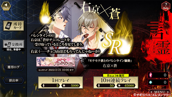 株式会社エレメンツリー(代表取締役:小川 邦弘、所在地:大阪市中央区)は、2022年2月4日にホラーBLゲーム『チギリバコ』(CV.四ツ谷サイダー、鳩マン軍曹etc)言霊「スイートバレンタイン」の提供を開始しました。