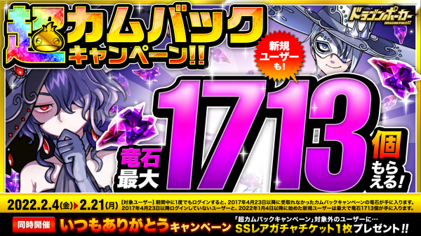 2月4日(金)より、久しぶりにログインするユーザーや新規ユーザーを対象に、竜石が最大1713個もらえる「超カムバックキャンペーン」を開催いたします。