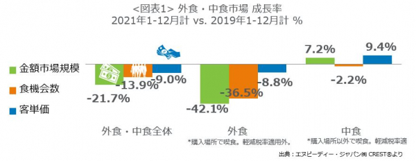 エヌピーディー・ジャパン、最新外食・中食レポート「2021年計、外食・中食売上はコロナ前2019年比21.7%減、デリバリー市場規模は2019年比89%増の7909億円」を公表