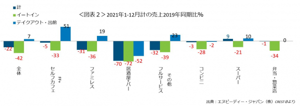 外食・中食市場全体の2021年1-12月計の売上は、16兆5096億円で、コロナ前の2019年同期比で21.7%減少でした(図表1)。前年同期比では、4.2%減で、2020年より市場が落ち込んだことが分かります。外食(イートイン)売上が2019年同期比42%減(2020年同期比13.5%)で大幅減でした。