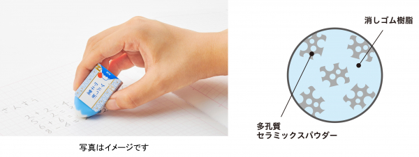 「富士山消しゴム」は、1989年に発売を開始したロングセラー消しゴム「エアイン」と同じ消しゴム樹脂を採用。多孔質セラミックスパウダーが無数のカドを生み出し、“いつもカドで消すような軽い消し心地”を実現しています。