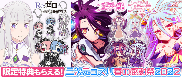 公式キャラクターコスチュームやアパレル、グッズの企画、開発、製造を行う株式会社コスパは、新商品の予約で【限定特典】が貰える『二次元コスパ 春の感謝祭2022』第2弾として『「ノーゲーム・ノーライフ」シリーズ』『Re:ゼロから始める異世界生活』から新商品・限定特典を発表。<5/26(木)18時〜>対象商品の予約受付を開始いたします。