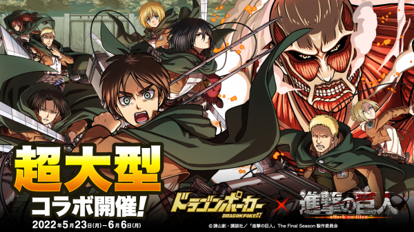 株式会社アソビズム(本社:東京都千代田区、代表取締役:大手智之)は、App Store・Google Playにて好評配信中のリアルタイム合体カードバトル『ドラゴンポーカー』で、2022年5月23日(月)よりTVアニメ『進撃の巨人』とのコラボイベントを開催いたします。
