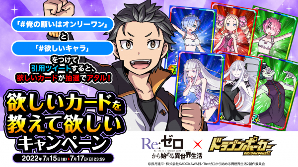 TVアニメ『Re:ゼロから始める異世界生活』×『ドラゴンポーカー』コラボ記念「欲しいカードを教えて欲しいキャンペーン」を、2022年7月15日(金)よりTwitterで実施!