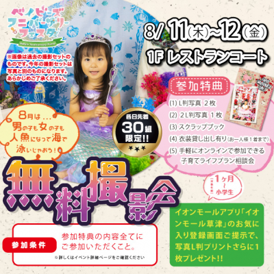 商業施設でのイベント企画・運営を行っている株式会社スペースクリエイションズは(本社:神奈川県川崎市、代表取締役:佐藤 誠史郎)、イオンモール草津にて『ベイビーズアニバーサリーフェスタ/夏休み無料撮影会』のイベント開催が決定しました。今回は先着30名様限定で、「人魚になって海を泳ごう」をテーマにした背景でお子様を撮影する無料撮影会と、オンラインで気軽に参加できる「お子様の未来を考える子育てライフプラン相談会」を実施します。