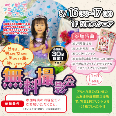 商業施設でのイベント企画・運営を行っている株式会社スペースクリエイションズは(本社:神奈川県川崎市、代表取締役:佐藤 誠史郎)、アリオ八尾にて『ベイビーズアニバーサリーフェスタ/夏休み無料撮影会』のイベント開催が決定しました。今回は先着30名様限定で、「人魚になって海を泳ごう」をテーマにした背景でお子様を撮影する無料撮影会と、オンラインで気軽に参加できる「お子様の未来を考える子育てライフプラン相談会」を実施します。