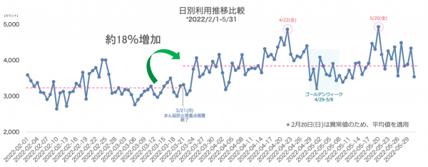次に、SSIDのみによる人数ボリュームを見みると、興味深いのは3月21日(月)のまん延防止等重点措置終了の前後とでは明らかに人数ボリュームに違いが見られることです。措置の前では日の平均ユニークカウント数は3,190カウントでしたが後では3,890カウントと約18%人出が増加していました。