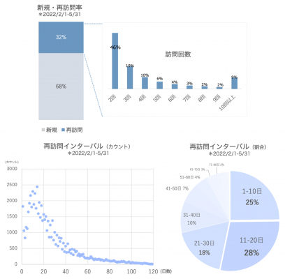 2月1日(火)〜5月31日(火)の期間中(120日間)では全体の約32%が再訪問をしていて、そのうちの約46%は2回の訪問でした。また、再訪問インターバルは11〜20日が最も多いことが分かります。