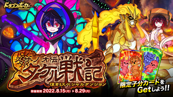 株式会社アソビズム(本社:東京都千代田区、代表取締役:大手智之)は、App Store・Google Playにて好評配信中のリアルタイム合体カードバトル『ドラゴンポーカー』で、2022年8月15日(月)より復刻スペシャルダンジョン「スサノオ伝タケル戦記」を開催いたします。