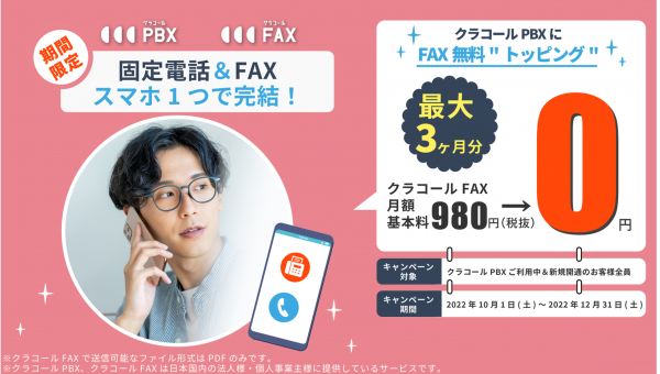 ビジネス向け通信サービスを提供する「株式会社三通テレコムサービス」は、2022年10月1日(土)より、スマホをビジネスフォン化する「クラコールPBX」をご利用中のお客様を対象に、メールのみでFAXの送受信ができる「クラコールFAX」を新規で利用開始した場合【最大3ヶ月間】月額基本料無料で使えるキャンペーンを開始いたします。