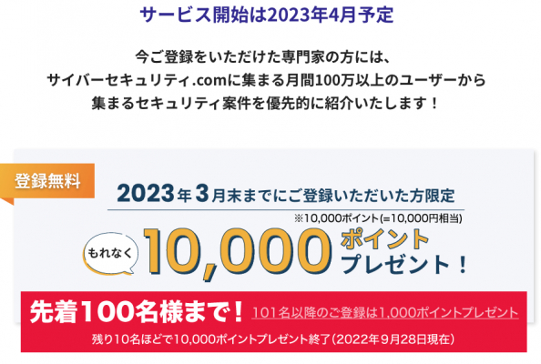 月間100万PV以上のサイバーセキュリティ専門メディア「 サイバーセキュリティ.com 」を運営する株式会社セキュアオンライン (本社:千葉県柏市 代表取締役社長:角田優剛)は、2023年4月開始予定の「情報セキュリティ専門家と企業のマッチングプラットフォームサービス(以下「当サービス」)」について、2022年9月2日(金)より開始した専門家の事前登録が順調に伸び、3週間で90名近くの専門家さまにご登録いただけております。