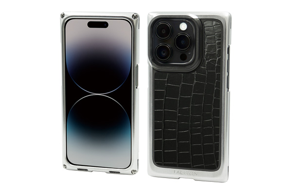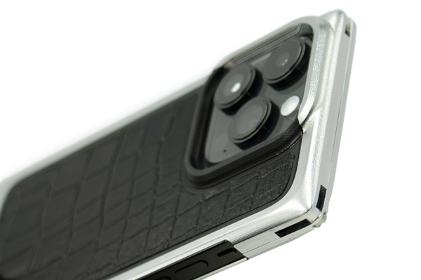 シンプルな中にも存在感があるデザインの、バックパネル付きジュラルミン削り出しジャケット。内部には衝撃吸収シートを貼り合わせ、4か所のストラップホール付き。レンズの外周は深いプロテクターがあり、iPhone 14 Proのレンズ部分をしっかりと保護します。