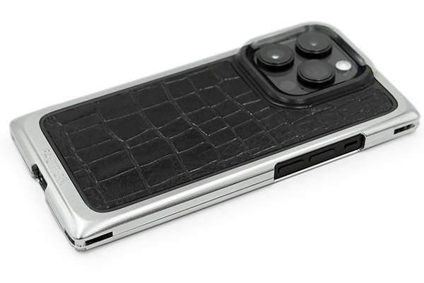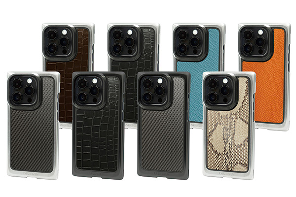 素材は、航空機にも使われる強固な「ジュラルミンA2017」と、さらに硬質で輝きが美しい「超ジュラルミンA2024」を使用。カラーは、シャイニーシルバーとブラックの2色。ブラックは「Black on Black」の名称で、ネジやバックパネルなど全ての部品が黒いオールブラックモデルです。本体はジュラルミンの塊から時間をかけて削り出し、手仕上げで磨き上げます。ジャケット背面のバックパネルは、リアルカーボンファイバー(ブラック)とクロコ型押し天然牛革(ブラック、ブラウン)、牛革シュリンクレザー(ライトブルー、タンジェリン)。更にスペシャルモデルとして、パイソンレザー(本蛇革)のラインナップもあります。