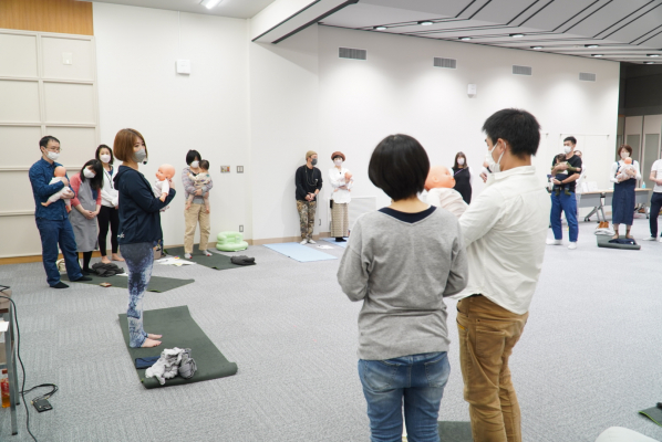「赤ちゃんのやわらか抱き方講座」では、正しい抱っこの仕方、抱っこをする側の体の負担を軽減する抱き方などについて学びます。赤ちゃんの正しい抱き方を学ぶことで、親の育児負担や悩み・不安を軽減、育児への自信を養います。