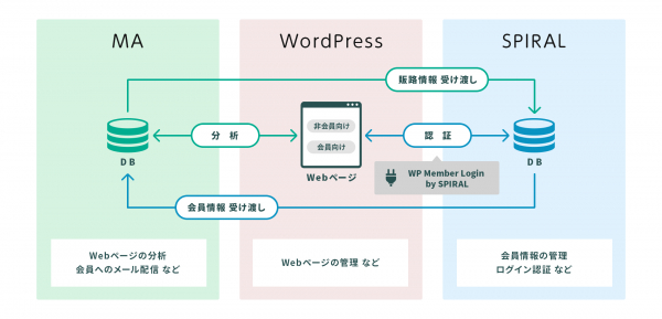 みらいマーケティングは、顧客である機器メーカーのオウンドメディアを構築しました。Webページの管理には顧客の使い慣れたWordPressを、Webページの分析や会員向けメール配信には既存のMAツールを、そして会員情報の管理やログイン認証機能などには厳格なセキュリティ体制の「SPIRAL」を利用しました。サイト上のコンテンツは会員向けと非会員向けに分かれているため、WordPressと「SPIRAL」を、パイプドビッツが提供するWordPress公式プラグイン「WP Member Login by SPIRAL」で連携し、会員サイトへのログイン時に「SPIRAL」の会員情報を参照して、コンテンツの出し分けを実現しています。また、既存のMAツールと「SPIRAL」をAPIで連携し、双方向の情報共有と活用を実現しており、みらいマーケティングの顧客は「SPIRAL」に登録された会員情報をMAツールに取り込み、メールによる顧客育成などを行ったり、MAツールの販路情報を「SPIRAL」の会員情報に反映したりして情報を活用しています。