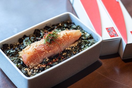手間暇かけてじっくり漬け込んだ昆布巻き明太子を、海苔を敷いたほかほかごはんの上に乗せ、旨味成分たっぷりの「特製かけだれ」をかけて食べる福岡の新しい味。幸せが重なるといわれる特製重箱に、明太子(めでたいこ)を丸ごと1本使用、昆布(よろこんぶ)を丁寧に巻き付けていることから、縁起物として大変人気です。