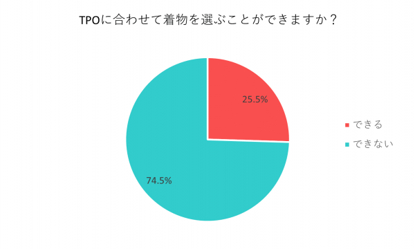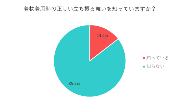 今回実施したアンケート調査では、74.5%が「TPOに合わせて着物選びできない」と答えたことが明らかになりました。また「和装時の立ち振る舞いを知っているかどうか」の問いに対し、「立ち振る舞いを知らない」と答えた人は全体の8割にのぼることもわかりました。