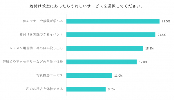 最も多かったのが「和のマナーや教養が学べる」で22.5%でした。次いで「着付けを実践できるイベント」21.5%、「レッスン用着物・帯の無料貸し出し」18.5%、「帯留めやアクセサリーなどの手作り体験」17%、「写真撮影サービス」11%、「和のお稽古を体験できる」9.5%でした。