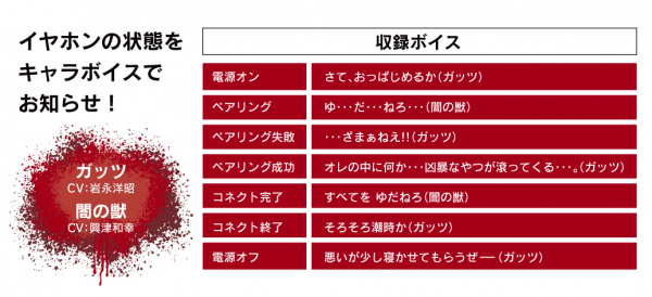 本コラボレーションモデルは、TVアニメ『ベルセルク※1』の劇中に登場する「狂戦士の甲冑」モデルとなっており、左右ハウジングには狂戦士の甲冑をモチーフにした重厚感のあるデザインを入れ、充電ケースにはベルセルクの象徴的なシンボル「生贄の烙印」のデザインを印刷加工しております。また特筆する点として、狂戦士の甲冑デザインの左右ハウジングを装着した際に、ボイスガイダンスで主役のガッツ(VC:岩永洋昭)と闇の獣(VC:興津和幸)の掛け合いによる、まるで狂戦士の甲冑を装着したような気分が味わえる演出を搭載しております。