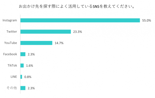 今回実施したアンケート調査では、SNSをお出かけ先探しの参考にしている割合が6割強にのぼることが明らかになりました。またユーザーの半数以上がお出かけ先を探す際に「Instagram」を利用していることもわかりました。