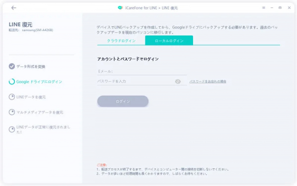 Step3:LINEのデータをAndroidに復元するには、画面の指示に従って、GoogleドライブでLINEのFree Calls & Messages権限を許可し、「すでに信頼」タブします。LINEのバックアップに使用したGoogle Driveのアカウントとパスワードを入力し、「ログイン」をクリックします。