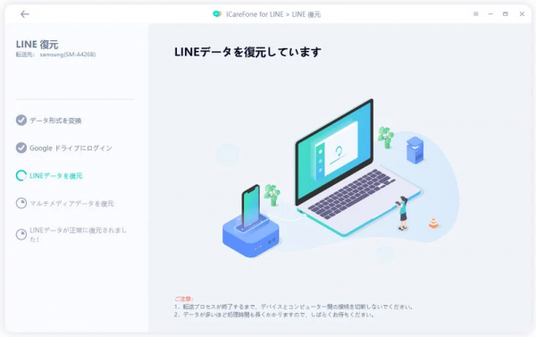 Step4:Googleアカウントにログイン後、すぐにLINEの復元作業にアクセスできます。LINEのデータがAndroidに復元されると、Android端末が再起動されます。その後、LINEのデータを確認できます。