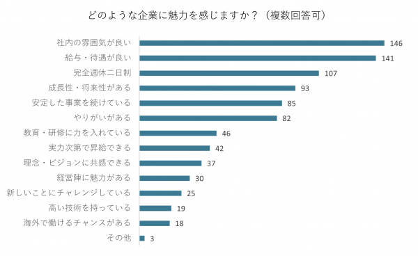 「社内の雰囲気が良い」が最も多く146票、次いで「給与・待遇が良い」141票、「完全週休二日制」107票、「成長性・将来性がある」93票、「安定した事業を続けている」85票と続きます。多くの人が「雰囲気の良い会社に就職したい」と考えていることがわかりました。