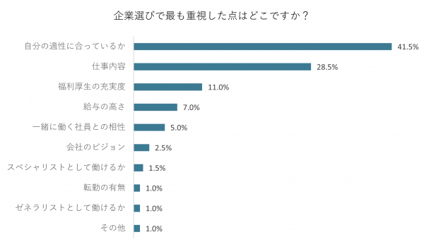 「自分の適性に合っているか」41.5%、「仕事内容」28.5%、「福利厚生の充実度」11%、「給与の高さ」7%、「一緒に働く社員との相性」5%、「会社のビジョン」2.5%、「スペシャリストとして働けるか」1.5%、「転勤の有無」「ゼネラリストとして働けるか」が同率で1%、「その他」と答えた人は1%でした。
