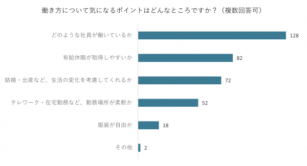 働き方について気になるポイントをたずねたところ、「どのような社員が働いているか」が128票となり、多くの人が人間関係の良好な職場で働きたいことがわかりました。