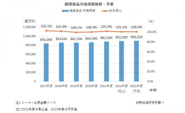 健康食品の市場規模はメーカー出荷金額ベースで、2021年度が8,825億円(前年度比1.9%増)と推計し、2022年度が8,925億円(同1.1%増)と見込む。