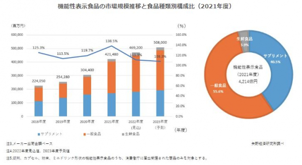 サプリメントに関しては、2020年度までは大型商材の機能性表示食品化や、積極的な広告展開によるヒット商品の誕生などがみられ市場が急拡大していたが、これらの動きは一巡化し、2021年度以降は成長が鈍化した。