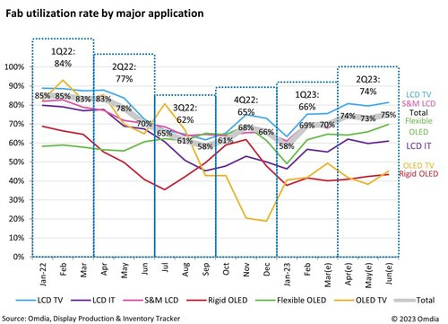 2023年第2四半期では、受注の増加や駆け込み需要の急増があったとしても、ほとんどのLCDメーカーが80%以上の稼働率を設定しています。