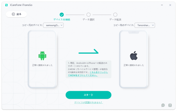 手順1:iCareFone iTransGoをウンロードして起動します。メインインターフェースから「Android to iOS」箇所の「Start」ボタンをクリックします。お使いのAndroidとiOSデバイス両方をコンピューターに接続します。