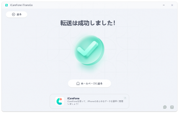手順3:選択したデータは対象のデバイスに転送されています。転送中は接続を切らないでください。以下の画面が表示されたら、すべてのデータが正常に転送されました!
