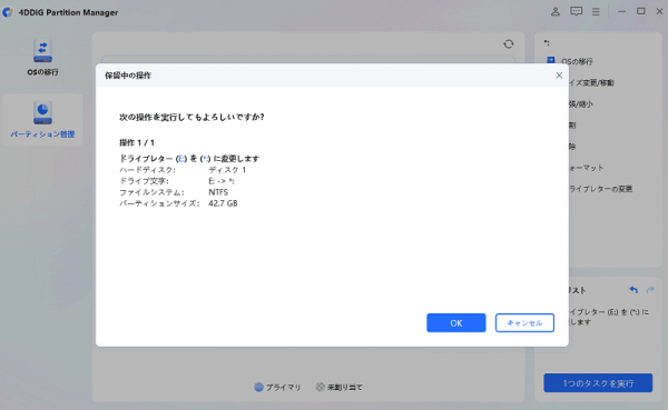 手順3.新しいドライブ文字を含むパーティションのプレビューが表示されます。「タスクを実行」をクリックし、「OK」を選択して変更を開始します。