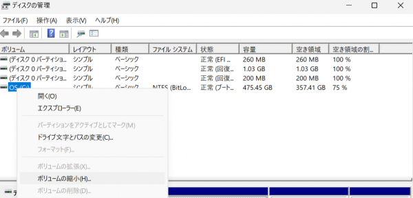 (1)ディスクの管理で、縮小したい未割り当ての領域またはパーティションを右クリックし、「ボリュームの縮小」を選択します。