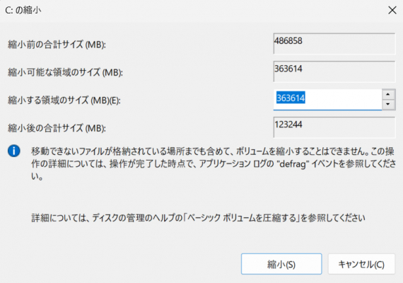 (2)縮小する領域の量を指定し、新しいパーティションを作成します。