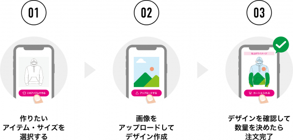 注文フローも簡単で、作りたいアイテム・サイズを選択した後、画像をアップロードしてデザイン作成。最後にデザインを確認して数量を決めたら注文完了です。