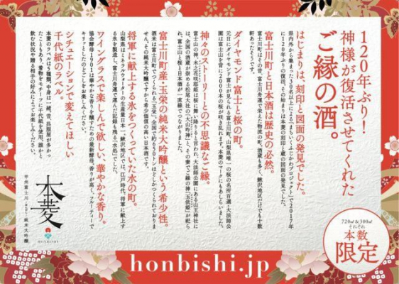 120年の時を経て山梨県富士川町によみがえった幻の日本酒 「甲州富士川・本菱・純米大吟醸2023」販売開始 〜 過疎の町から世界へ! 銘酒復活による地域活性化プロジェクト 〜