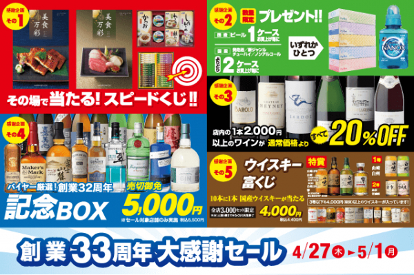おかげさまでリカーマウンテンは創業33周年!4月27日からたくさんの感謝企画と共に「創業33周年大感謝セール」を開催致します