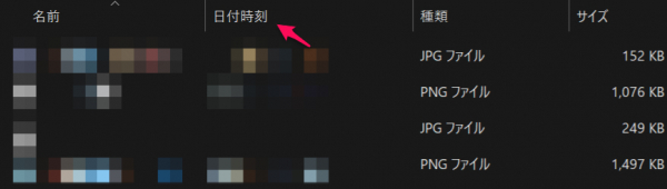 左上の「表示」タブをクリックし、「詳細」を選択します。「サイズ」または「更新日」のカラムヘッダーをクリックすると、写真をサイズまたは日付で並べ替えられます。