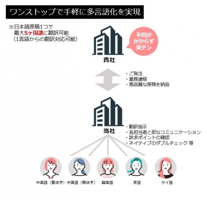 本サービスは宿泊施設や商業施設、小売店を主な対象とした訪日観光客向け専門の翻訳サービスで、日本語の原稿をご用意いただくだけで、中国語(簡体字)・中国語(繁体字)・韓国語・英語・タイ語の最大5か国語に翻訳するサービスです。