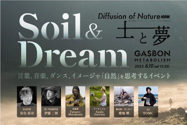 【Diffusion of Nature 2023 土と夢】のGASBON METABOLISM会期中のスペシャルイベントとしてトーク、ダンス、音楽と会場を彩る様々な芸術表象を通して「自然」を感じ、思考するイベント「Soil & Dream」を開催します。