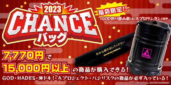 そして福袋限定グッズとして、ミリオンゴッドの折り畳み傘と、 A PROJECTのLEDランタンをご用意しました。